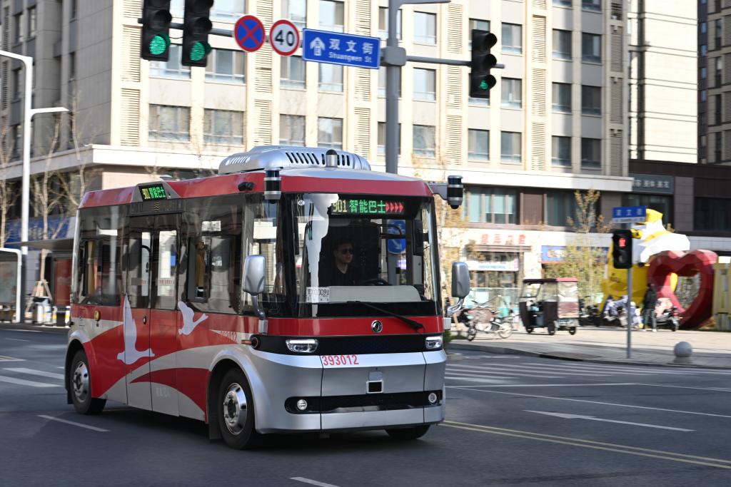 无人驾驶智能网联巴士在雄安新区容东片区道路上行驶。新华社记者牟宇 摄