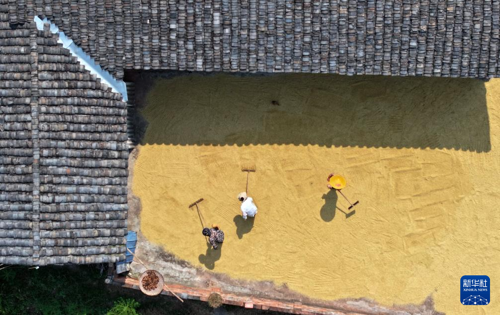 8月15日,在四川省内江市东兴区郭北镇亢家村,村民在晾晒稻谷(无人机照片)。