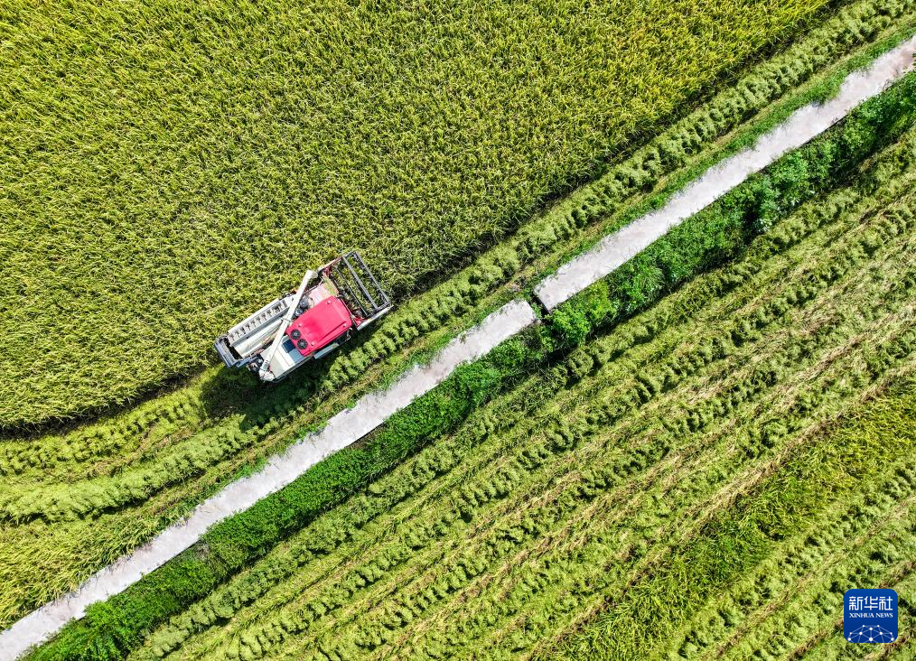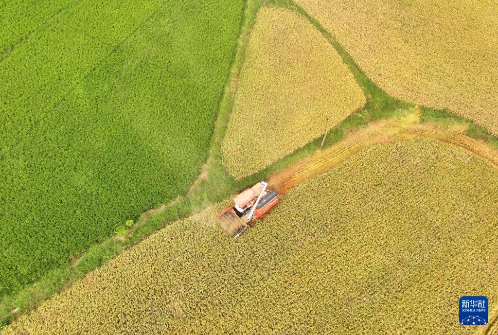 8月15日,在湖南省衡阳市衡山县白果镇,村民驾驶农机收割水稻(无人机照片)。