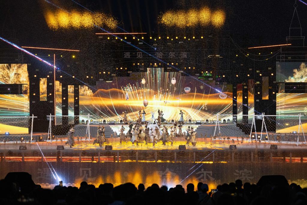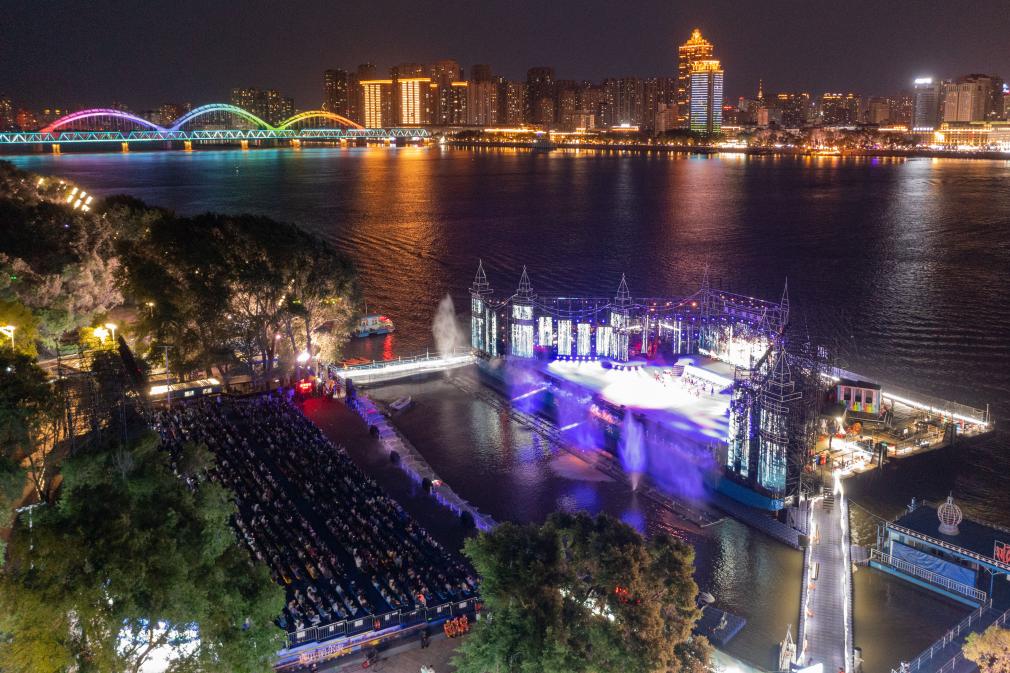 6月10日,观众欣赏在松花江哈尔滨段江畔上演的《遇见·哈尔滨》演出。
