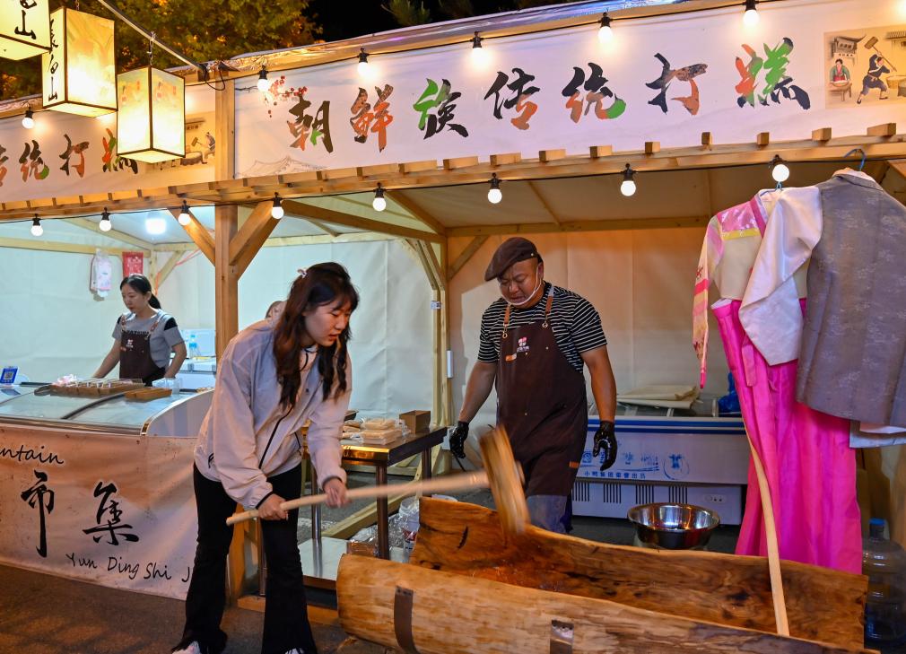 6月13日,在吉林二道白河镇的云顶市集,游客体验朝鲜族传统打糕。
