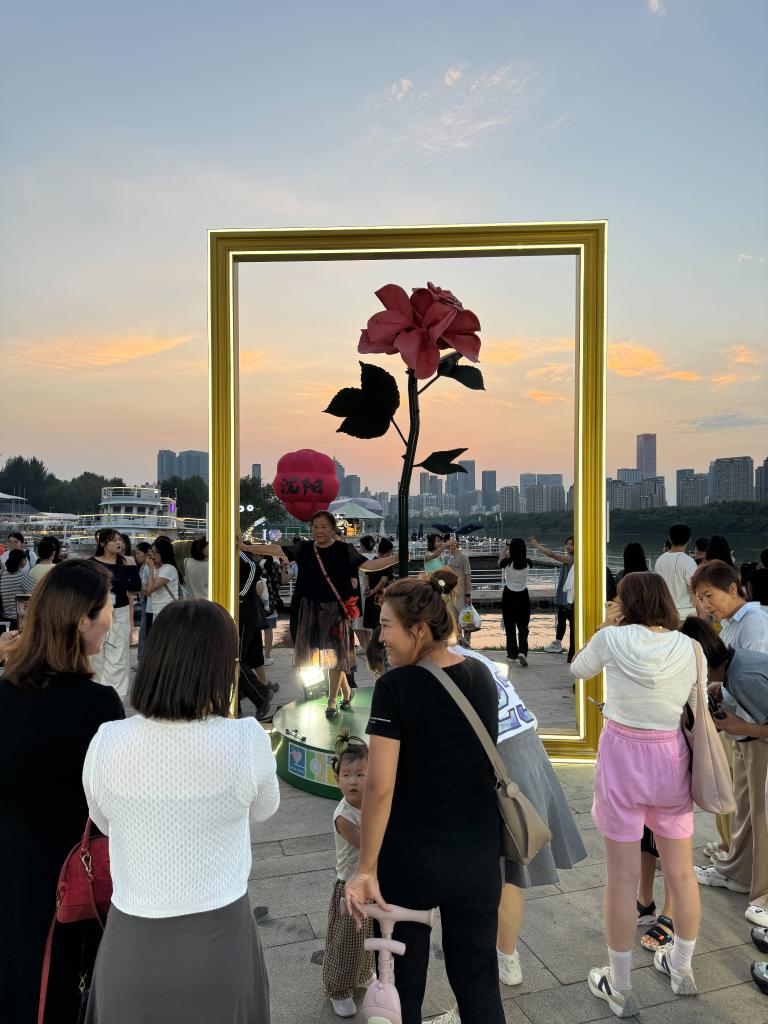 8月23日,游人在沈阳的浑河外滩市集游玩。