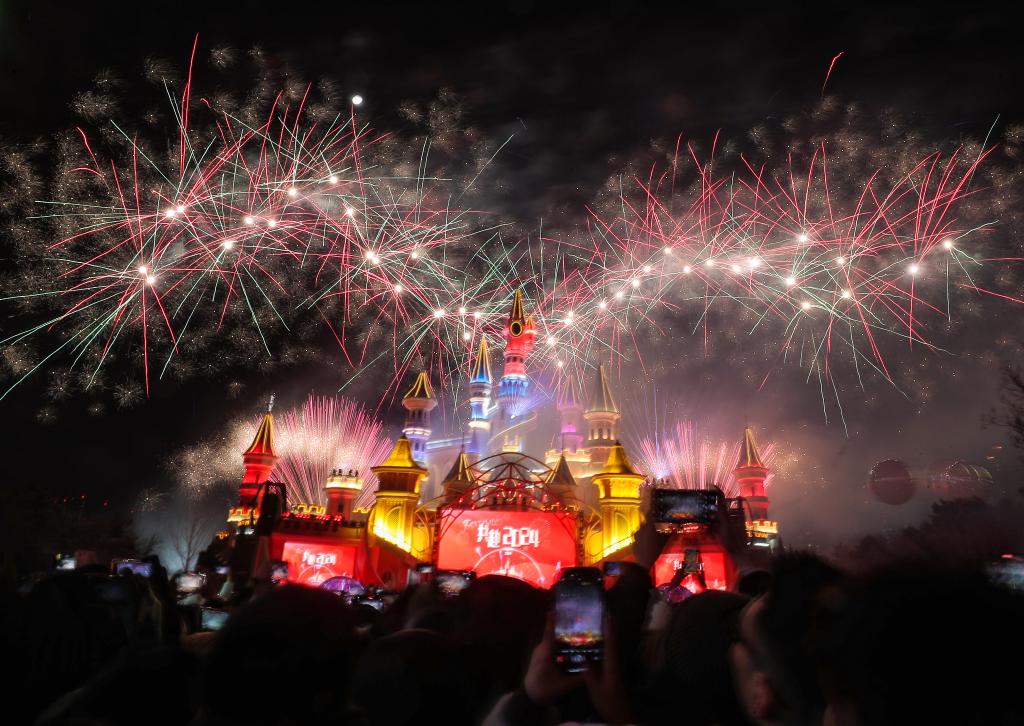 1月1日,游客在沈阳方特欢乐世界观看烟花表演。