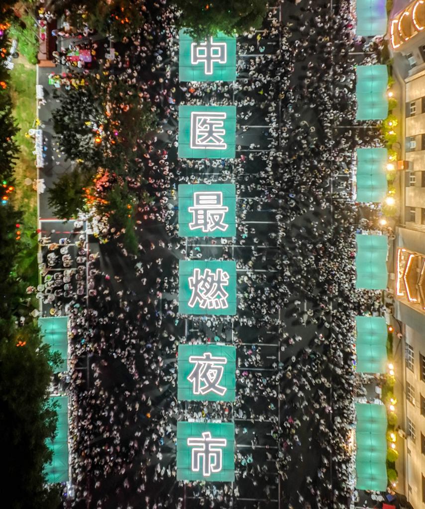 8月9日,沈阳市民在中医药文化夜市上游玩(无人机照片)。
