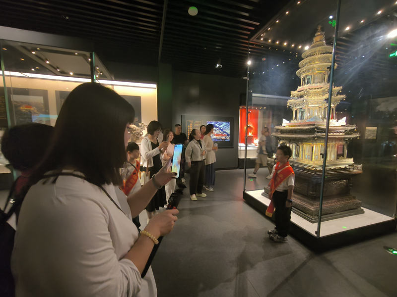 8月21日,河北省承德博物馆“小小讲解员”范腾升正在向游客讲解清代紫檀木座铜胎珐琅塔的故事。新华网发(承德日报社记者 张雨樵 摄)pagebreak