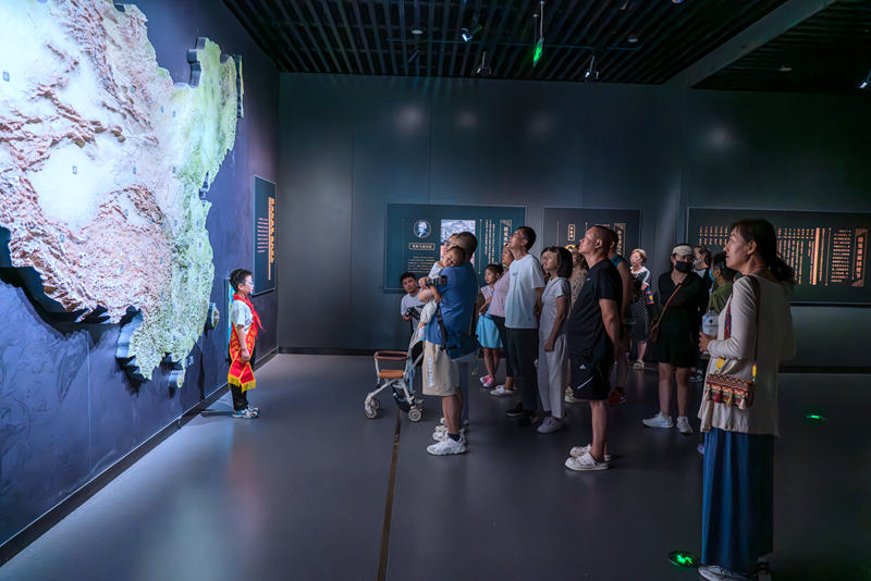 8月21日,河北省承德博物馆“小小讲解员”范腾升正在向游客讲解清朝版图。 新华网记者 钟奕 摄pagebreak