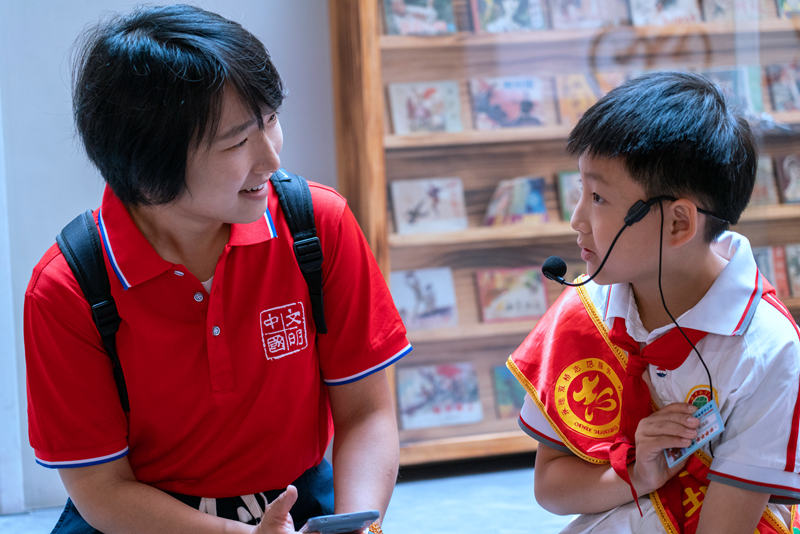 8月21日,河北省承德博物馆“小小讲解员”梁瑀航和“文明中国”主题采访报道组记者交流讲解心得。 新华网记者 钟奕 摄pagebreak