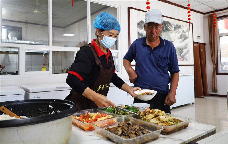 8月29日,沧州市青县流河镇人和镇村“孝老食堂”工作人员为老人打饭。新华网发(沧州广播电视台 刘冲 摄)