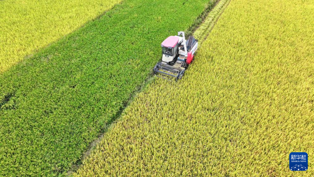 9月18日,在湖南省永州市道县梅花镇贵头村,农机手驾驶农机在收割稻谷(无人机照片)。