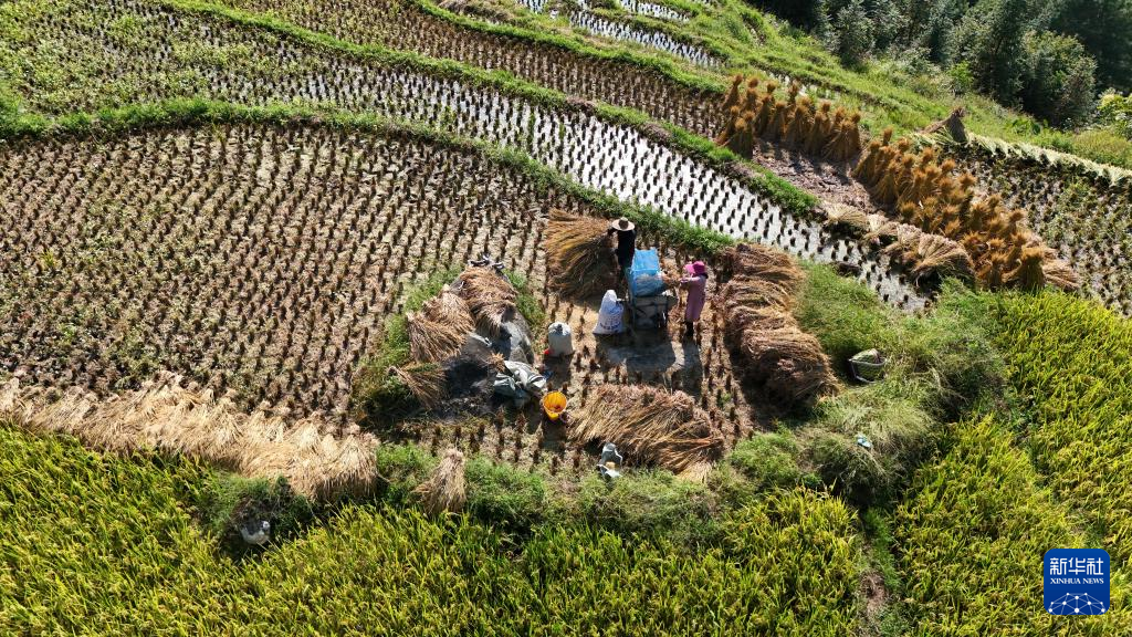9月18日,村民在广西龙胜各族自治县泗水乡泗水村小岩底梯田收获水稻(无人机照片)。