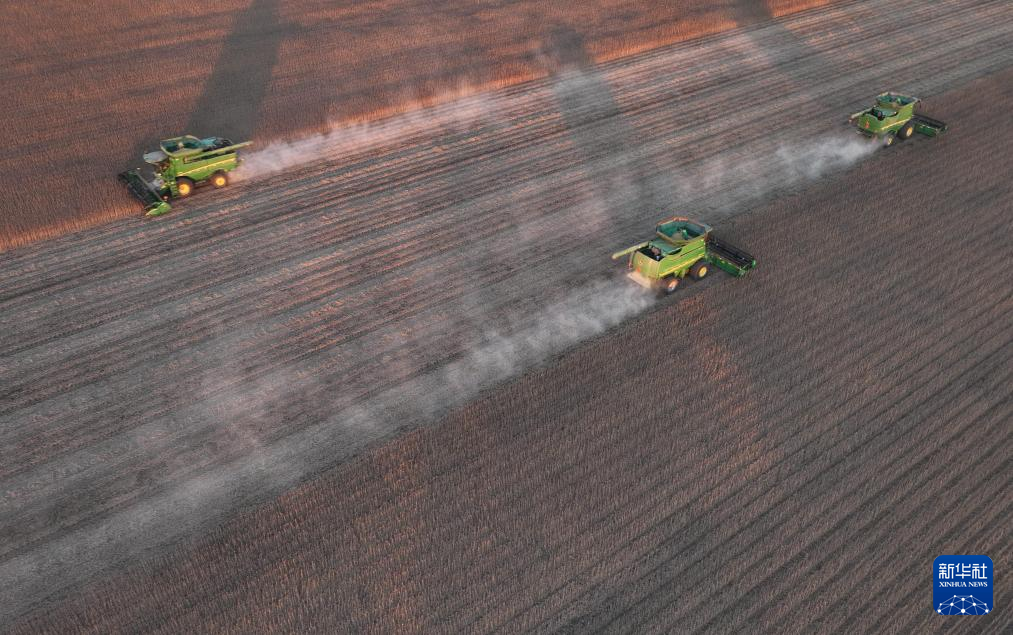 9月16日,在北大荒集团黑龙江大西江农场有限公司第五管理区,大型收割机在收获大豆(无人机照片)。