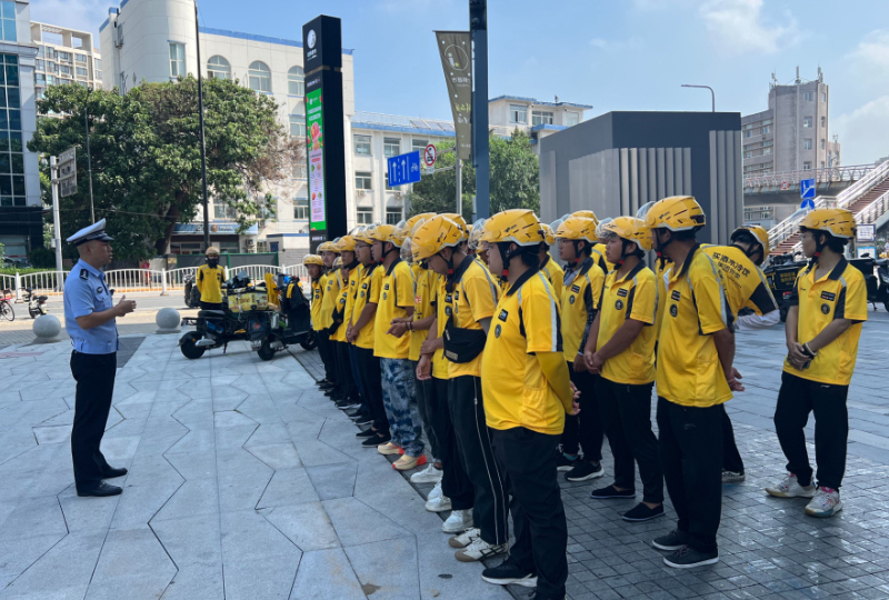 2024年7月31日,北京市大兴公安分局交通支队、大兴区商务局、大兴区文明办走进美团外卖清城站点,开展“文明交通 绿色出行”宣传活动。(北京市大兴区文明办供图)