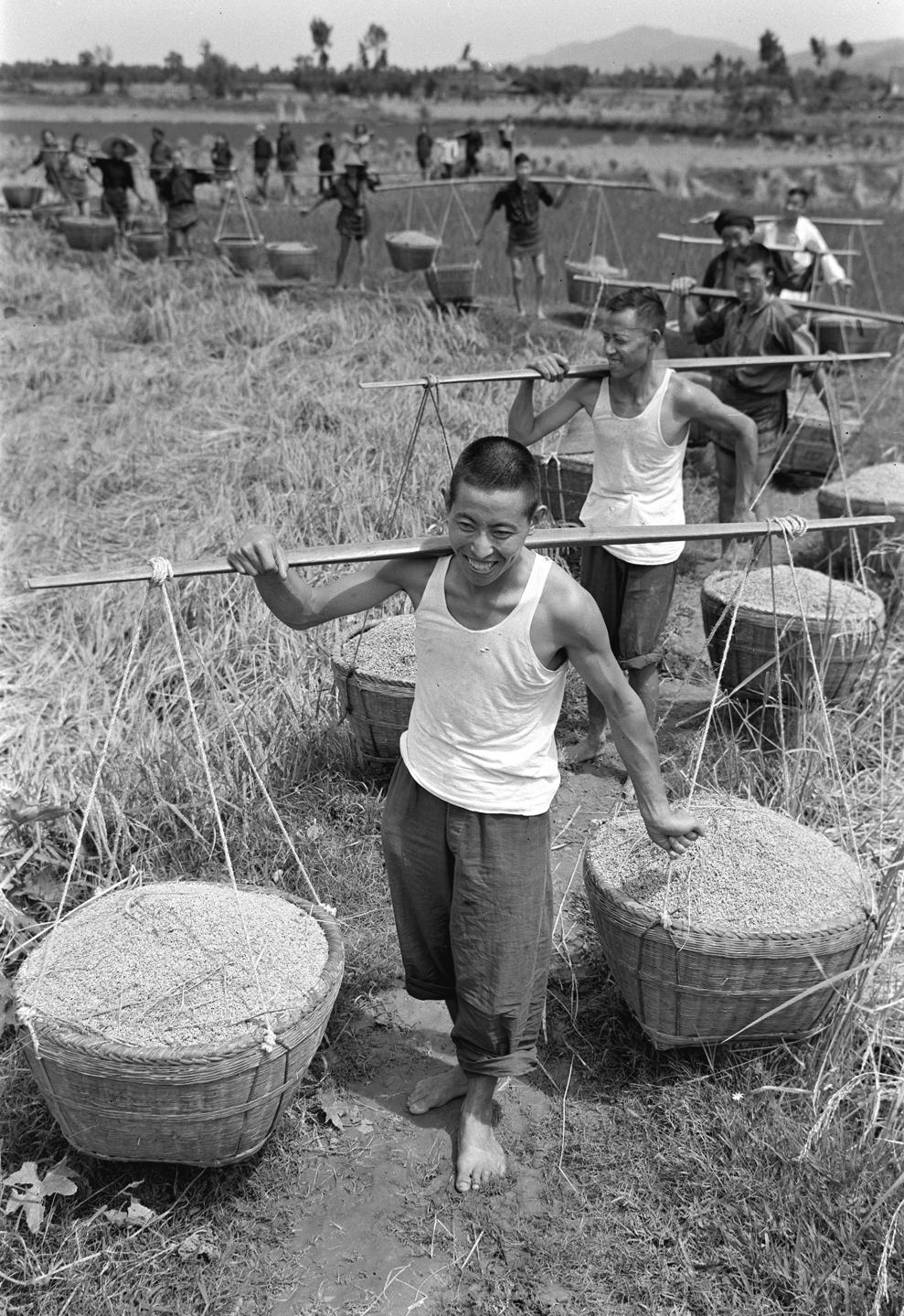 1960年,四川简阳的农民担着脱粒的水稻回队。新华社记者 孙忠靖 摄