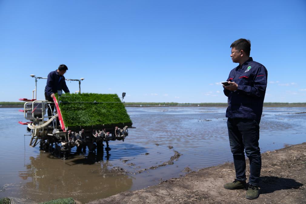 2022年5月18日,陆向导(右)用手机操控带有北斗导航系统的插秧机。新华社记者 王建威 摄