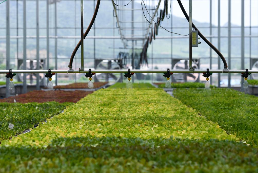 2024年6月24日,在陕西省太白县咀头镇一处蔬菜育苗大棚里,自动喷灌装置在给蔬菜苗浇水。
