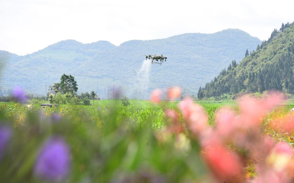 2024年7月22日,云南省曲靖市罗平县罗雄街道外纳村的农民用无人机进行玉米飞防作业。新华社发(毛虹摄)