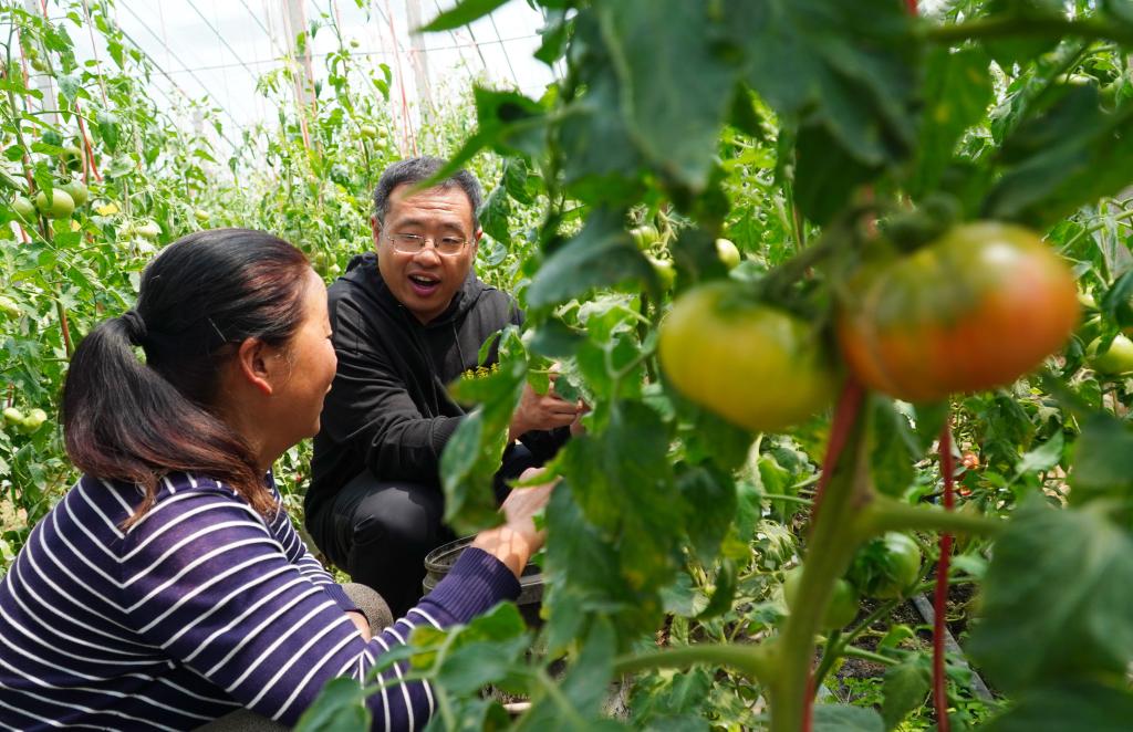 2024年4月22日,梁其安(后)与西红柿种植户交谈。新华社记者 徐速绘 摄