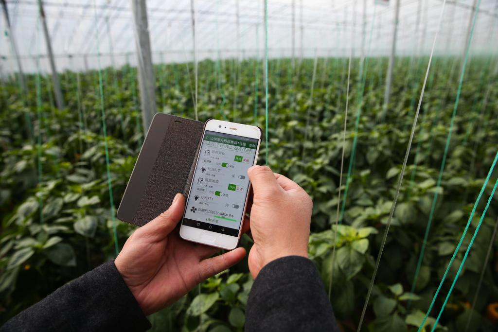2019年1月8日,崔江元通过手机调控智能化蔬菜大棚的参数。 新华社发(潘思危摄)