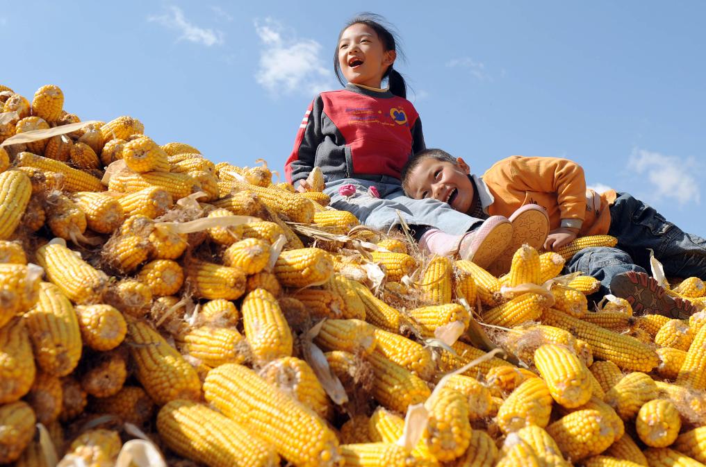 2008年9月30日,两名小朋友在黑龙江省绥化市东富乡东升村的玉米堆上玩耍。 新华社记者 徐家军 摄