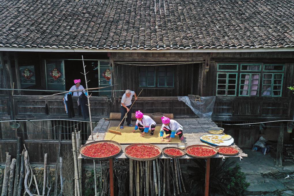 2022年9月14日,在广西龙胜各族自治县龙脊镇龙脊古壮寨,壮族群众在晾晒谷子和辣椒。新华社发(韦吉阳 摄)