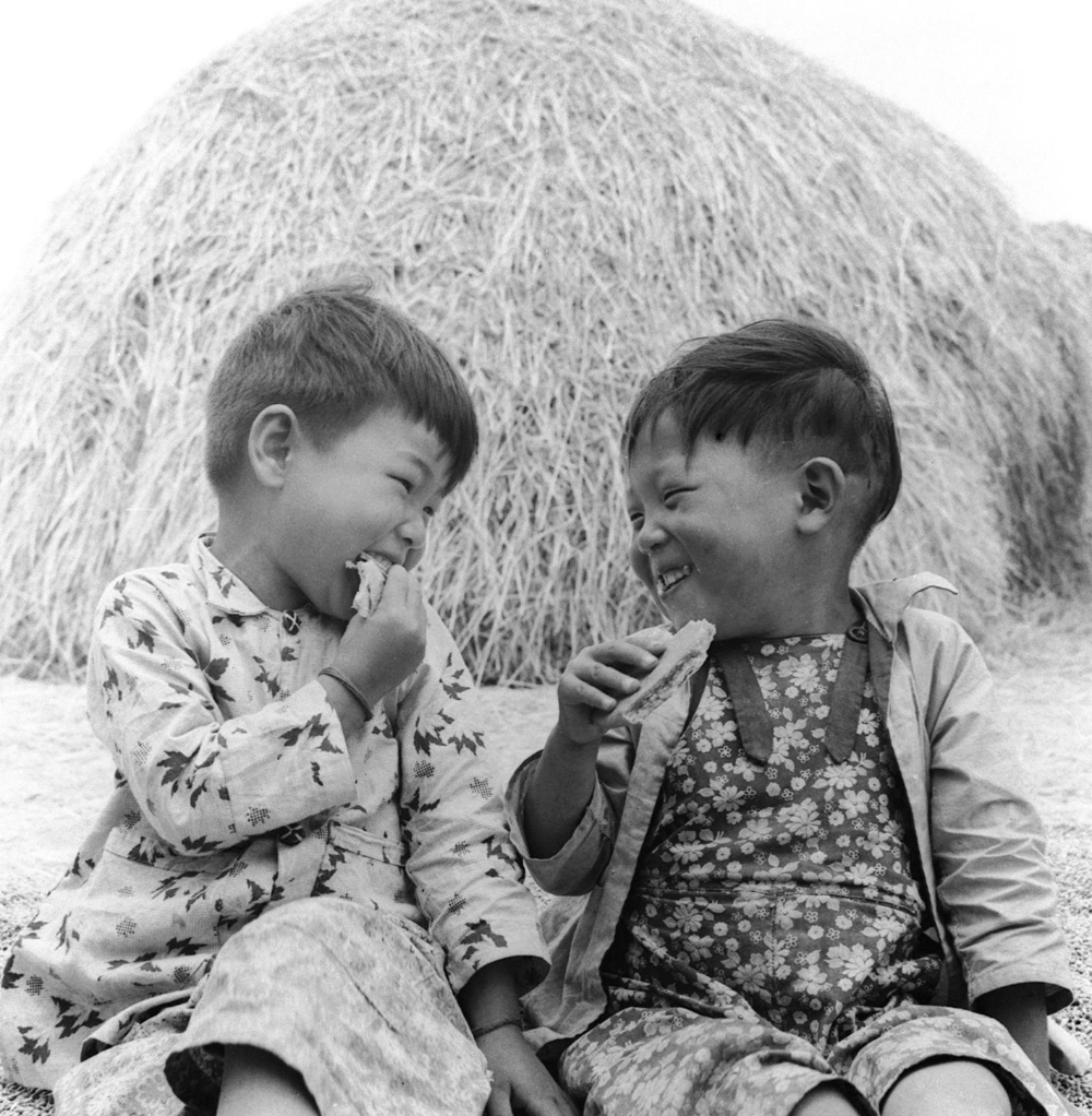 1957年,安徽凤阳的孩子品尝用新麦做的饼。新华社发(楼并铨 摄)