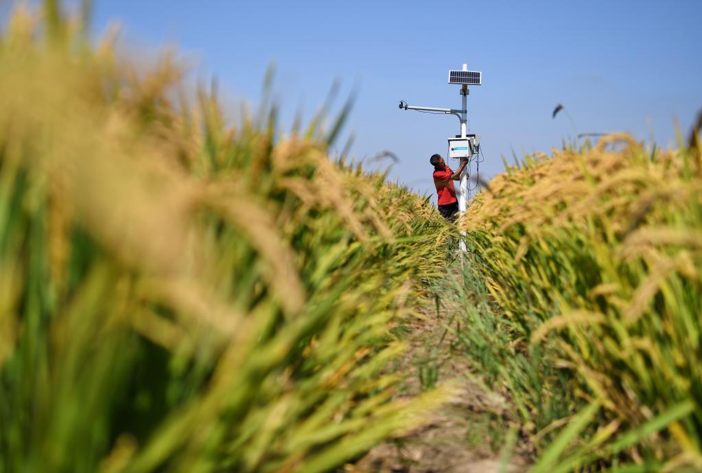 2023年9月14日,在由盐碱地改良而成的乐亭县数字循环农业智慧园区,工作人员在调整水稻田监控设施。新华社记者 牟宇 摄