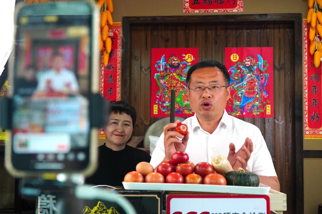2024年4月22日,梁其安为“黄金籽”西红柿进行直播销售。新华社记者 徐速绘 摄