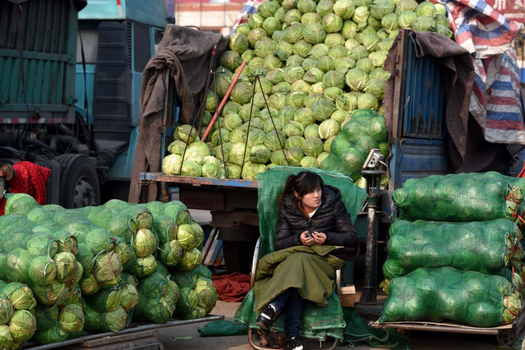 2014年11月19日,在山西省太原市河西农产品批发市场,一位蔬菜批发商在等待顾客,她的身旁堆满了茴子白。新华社记者 燕雁 摄