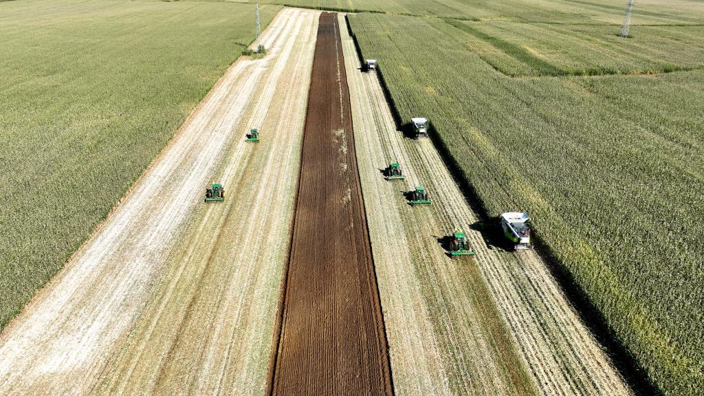9月22日,在由北大荒集团黑龙江共青农场有限公司全程托管的黑龙江省鹤岗市萝北县良种场玉米地块,大型作业机车在进行收获、打茬作业(无人机照片)。