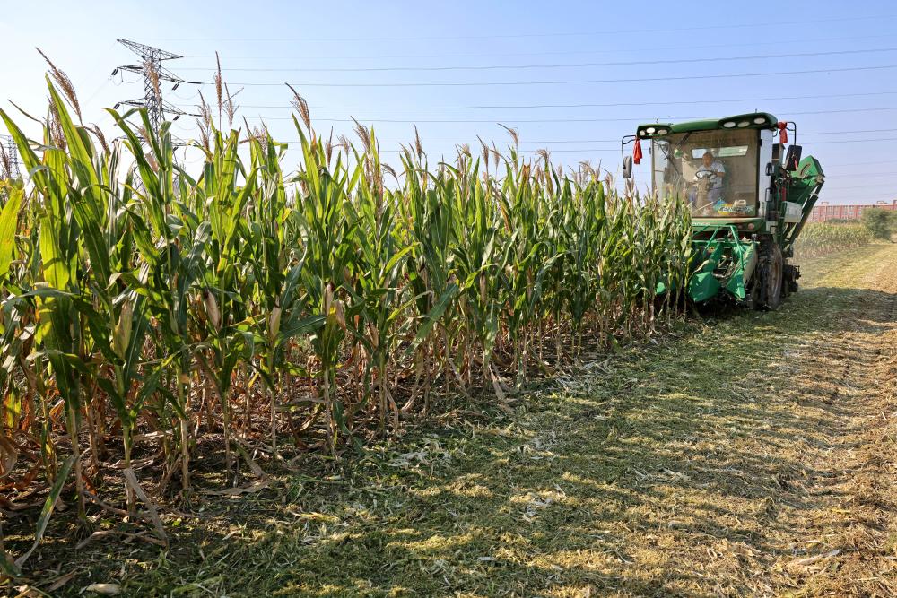 9月22日,在山东省枣庄市西王庄镇石羊村,农机手驾驶联合收割机在田间收获玉米。