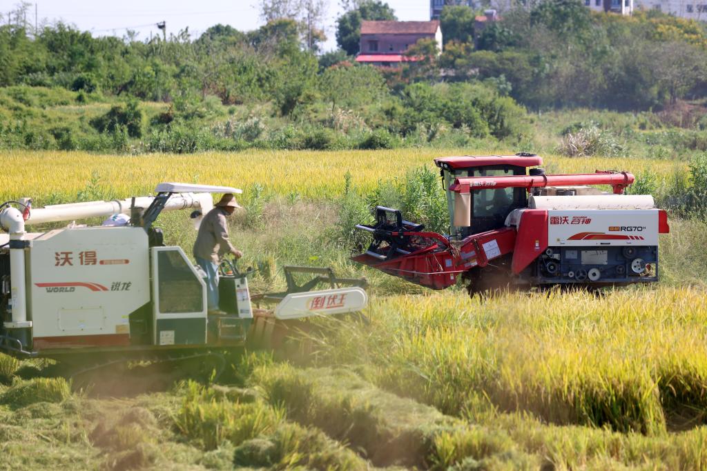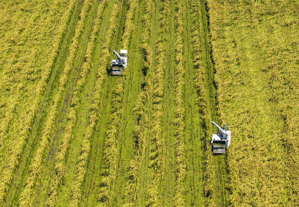 9月22日,在湖南省衡阳市衡山县开云镇,村民驾驶农机在收割稻谷(无人机照片)。