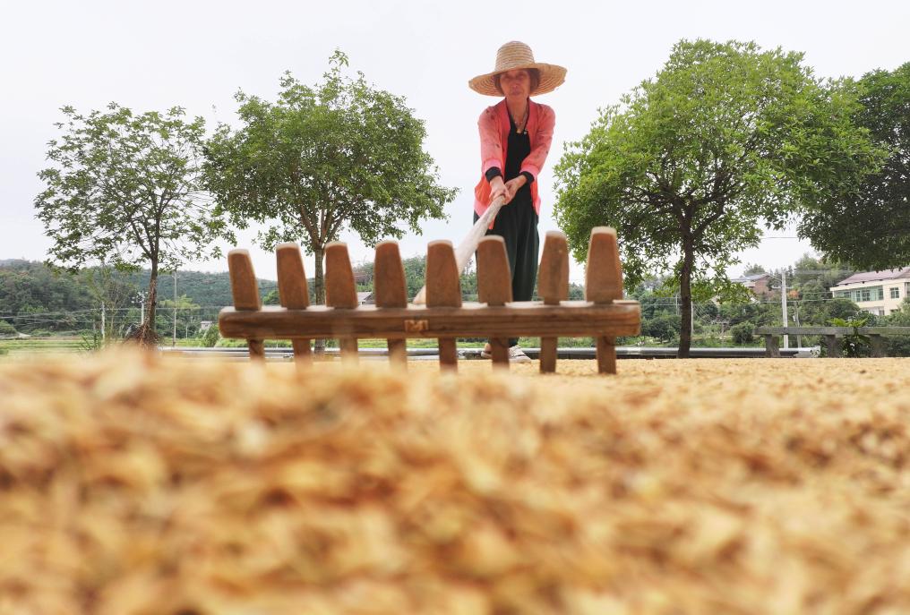 9月22日,湖南省衡阳市衡山县开云镇村民在晾晒稻谷(无人机照片)。