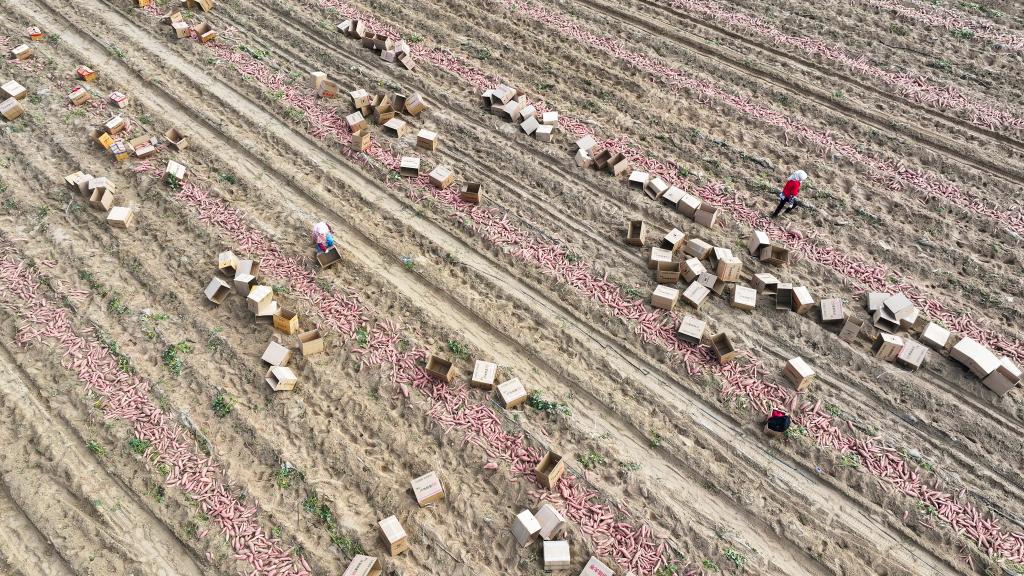 9月22日,河北省唐山市丰南区大新庄镇柳林三村的农民在田间收获红薯。