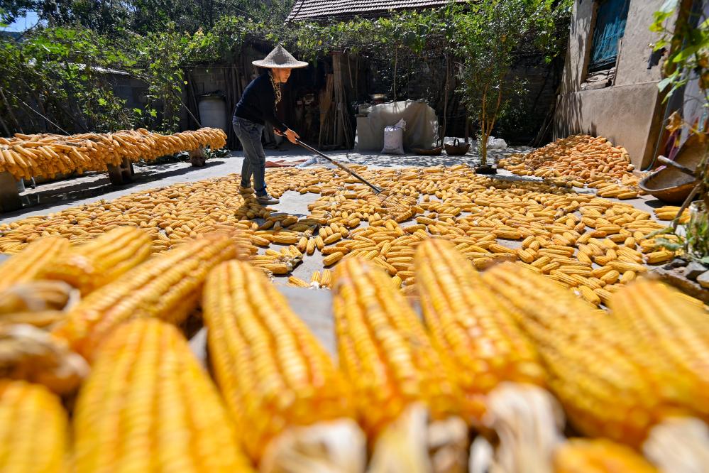 9月22日,山东省青州市庙子镇局子峪村农民在院子里晾晒玉米。