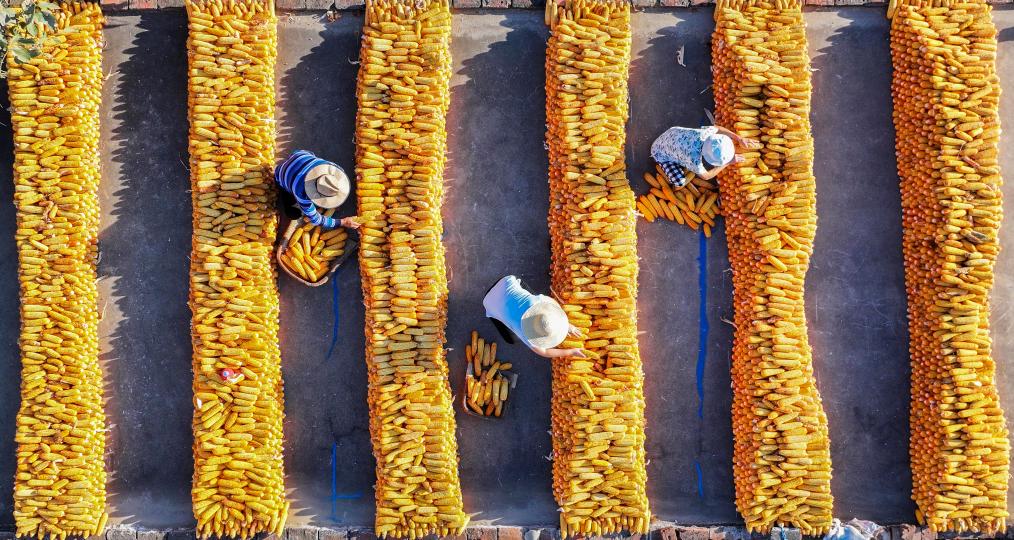 9月22日,河北省遵化市东新庄镇农民在场院晾晒玉米。