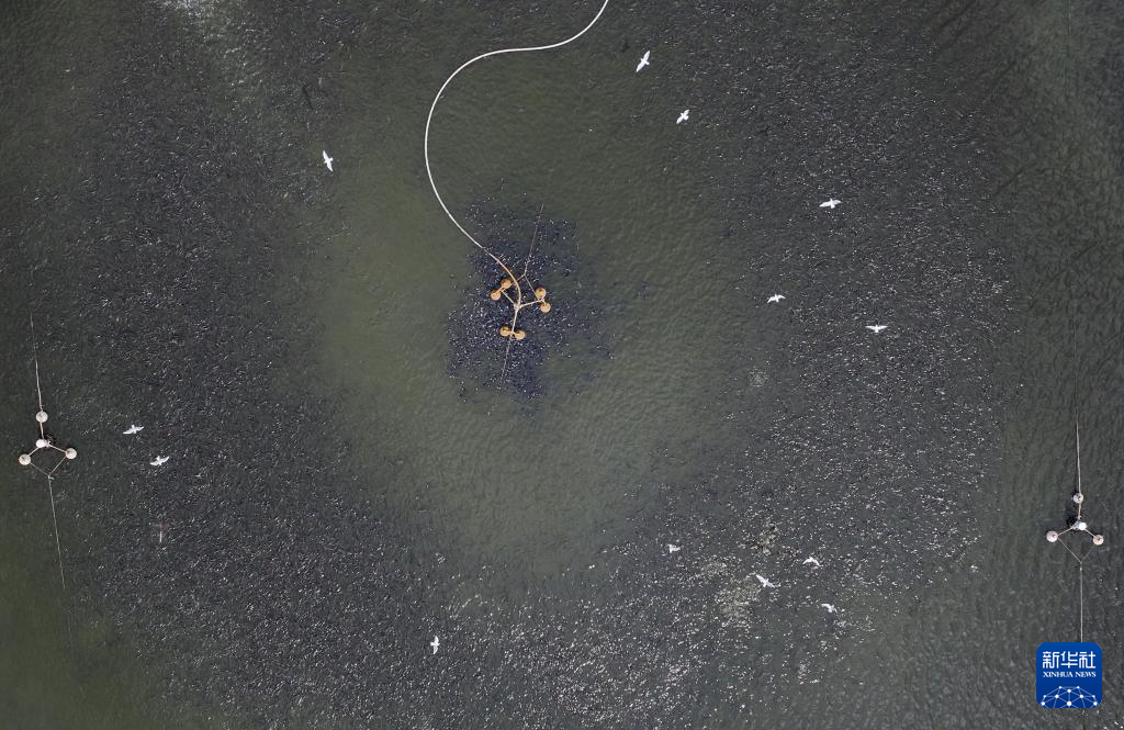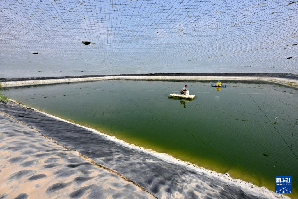 工作人员在宁夏银川市贺兰县常信乡谭渠村的蓝湾生态园南美对虾养殖基地查看南美对虾生长情况(9月19日摄)。