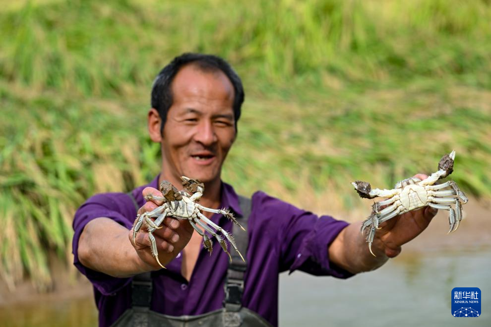 9月20日,工作人员在位于宁夏银川市贺兰县立岗镇永兴村的花田香蟹稻田主题公园内收获稻田蟹。