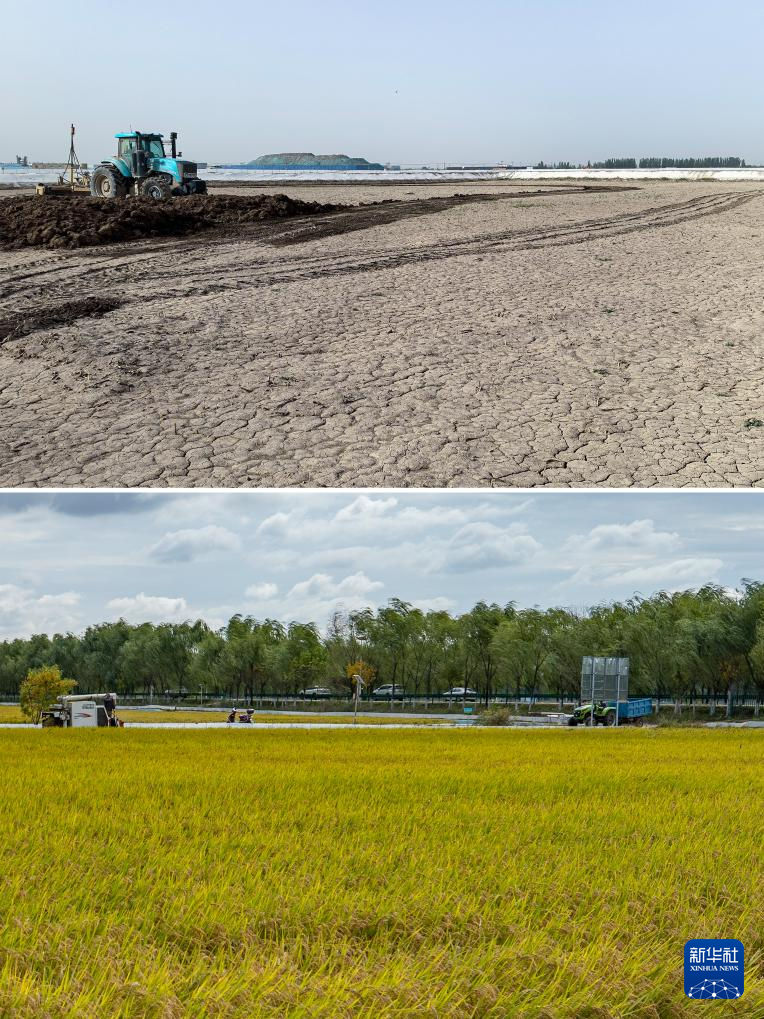 这是一张拼版照片。上图为2022年4月4日拍摄的宁夏农垦暖泉农场未经改良的盐碱化土地原貌(新华社发)。下图为北方民族大学杨国平教授通过微生物方式治理过的盐碱地上玉米的生长情况(9月21日摄,无人机照片,新华社记者杨植森摄)。