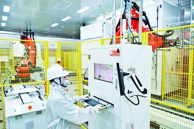 工作人员在蜂巢能源科技(盐城)有限公司生产车间内操作智能生产设备。