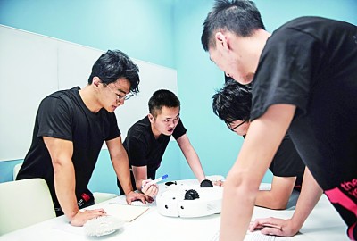 在位于广东深圳的云鲸总部,研发人员讨论扫拖机器人的设计。