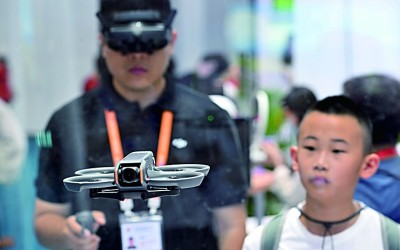 海南海口,工作人员在第四届消博会上演示大疆最新款无人机。