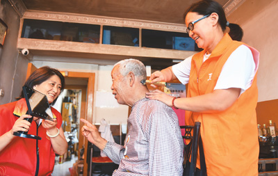 河南省洛阳市涧西区积极构建“嵌入式”养老服务体系,为老年人提供养老助餐、社区娱乐、健康管理、上门保洁等综合养老服务项目,让老人在家门口享受全方位养老。图为涧西区武汉路街道秦岭路社区,养老服务中心护理员和社区志愿者为居家老人理发。