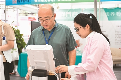 2024宁夏养老服务业博览会近日在宁夏银川市举办。本届博览会集中展示国内外养老服务前沿科技和最新成果,推动健康养老产业向更深层次、更宽领域、更全方位发展。图为会上工作人员向参观者介绍医疗产品。