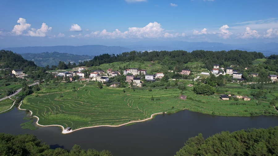 盛夏时节,綦江区郭扶镇同心村,一块块绿意葱茏的稻田沿山地平铺延伸,与近处的水库、远处的林海和村舍组成一幅田园风景画(资料图)。新华网发(重庆市綦江区融媒体中心 黄波 摄)pagebreak