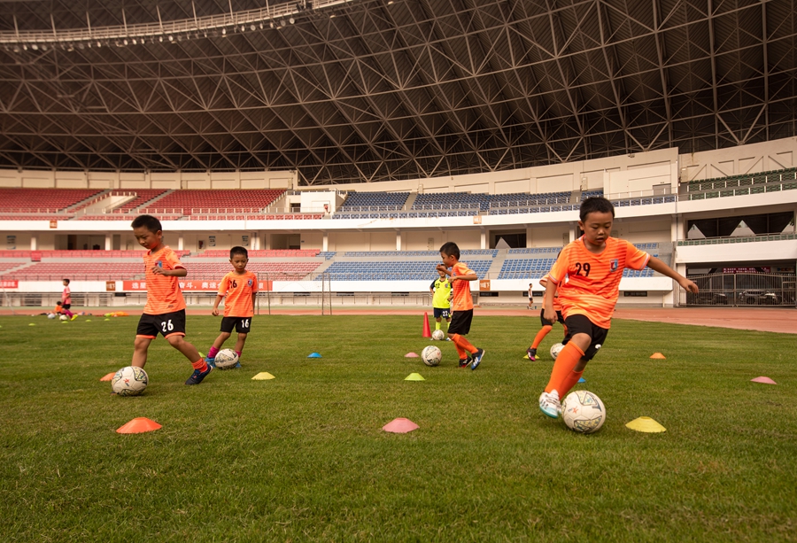 2022年8月16日,綦江区体育中心有不少孩子在参加足球训练。新华网发(重庆市綦江区融媒体中心 杨奇 摄)pagebreak