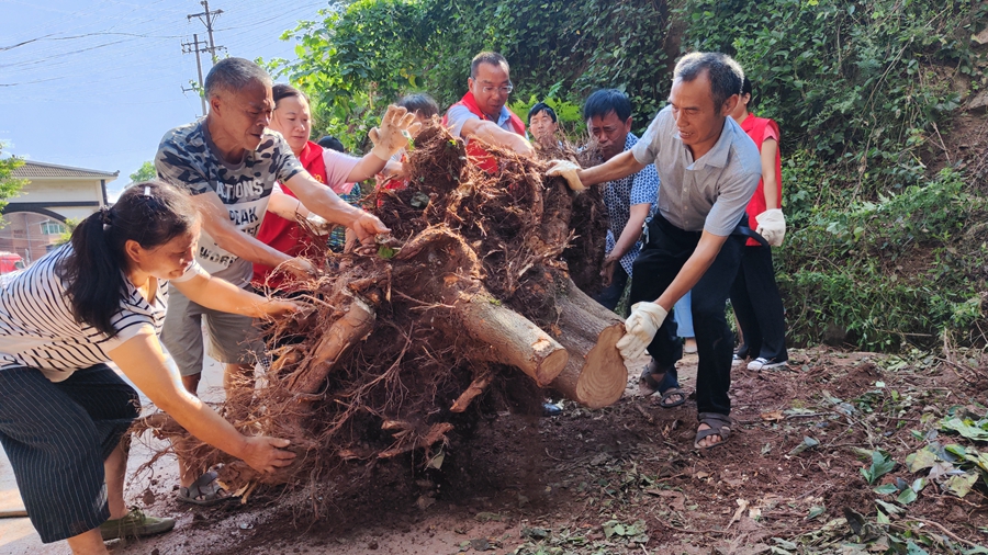 2022年7月8日,綦江区古南街道北渡社区在农贸市场开展“全民清洁日”志愿服务活动,志愿者们齐心协力将大树桩搬运进压缩车。新华网发(重庆市綦江区融媒体中心 周禹 摄)pagebreak