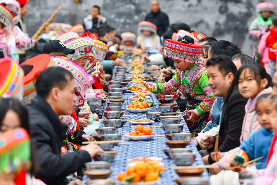 綦江区赶水镇,乡亲们围坐在一起吃“长桌宴”(资料图)。(中共重庆市綦江区委宣传部供图)pagebreak