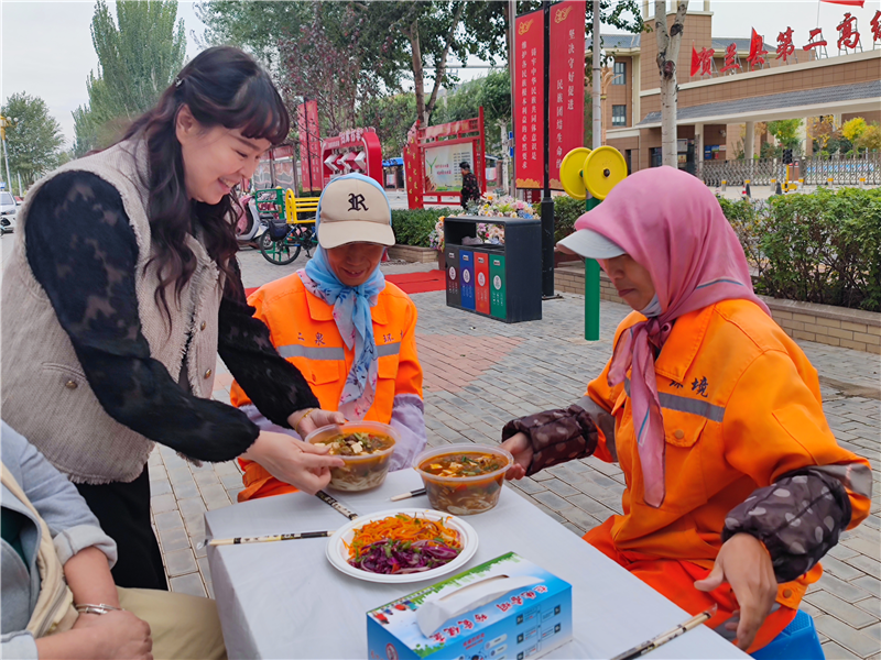 2024年9月26日,王冬梅将美味的“国庆面”送到环卫工人的手中,让他们吃出了节日喜庆,吃出了新时代、新生活的幸福感。新华网发(资料图)