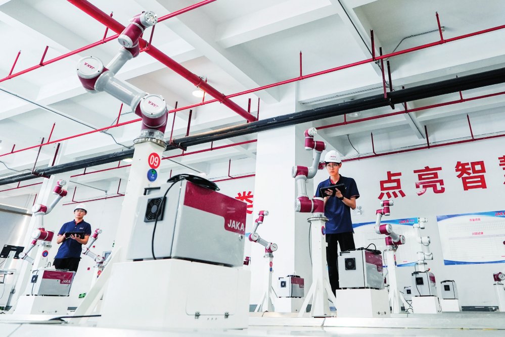 在位于江苏省常州市武进区的常州节卡智能装备有限公司制造基地,工作人员在对柔性智能协作机器人进行全系列测试(2024年6月14日摄) 李博摄/本刊