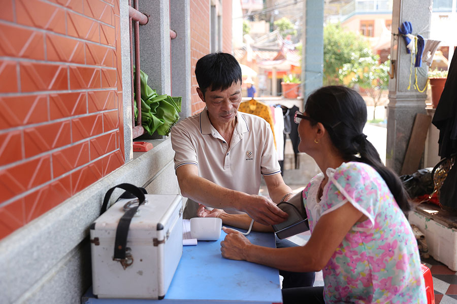 9月12日,“中国好人”、泉港区南埔镇惠屿岛上乡村医生肖锦璋正在为上门就诊的村民诊疗。新华网发(福建文明风网 颜财斌 摄)